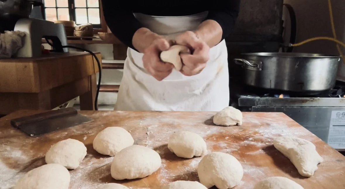 After it has risen, cup dough into 12 equal pieces and preshape into loose rounds and rest 5 minutes. Second shape dough rounds into tighter balls, drawing tension across the top and cinching in the bottoms by dragging across the table. Let rest 5-10 minutes. Shape dough balls into bagels by pinching a hole in the middle with your thumb and middle finger and gently drawing open the hole by stitching and pulling the dough while walking it around your hands in a circular motion. Place bagels on parchment lined sheet tray, cover and let rest for 1- 1 1/2 hours or until double in size. Watch video tutorial for shaping guidance.