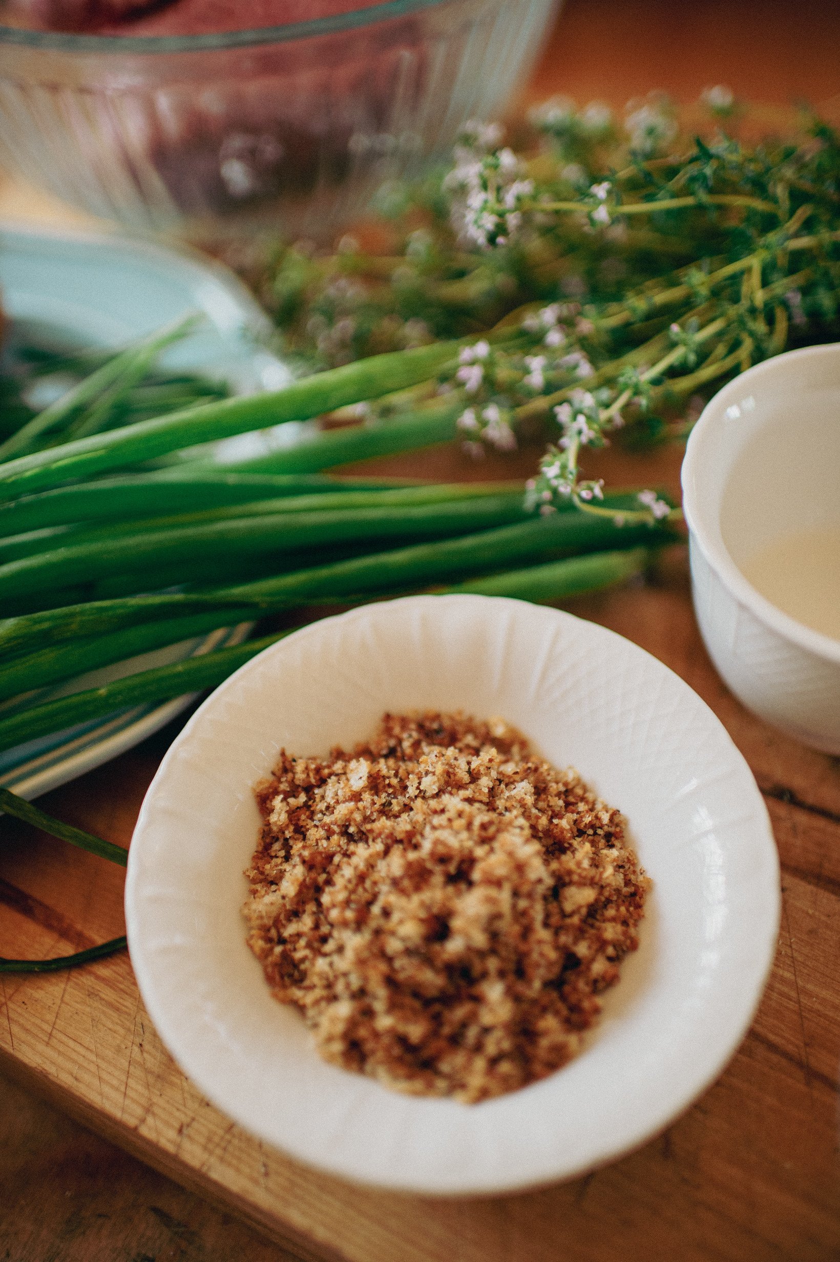 A quick bread crumb refresh: We have made breadcrumbs before here in the Sac(k), but I will remind you. Cut up a loaf of sourdough bread into cubes. Place on a sheet tray. Salt and pepper and some thyme leaves. Olive oil. Place in a 400 degree F oven until golden brown and crispy crunchy. Put the croutons into a food processor and pulse until fine crumbs.