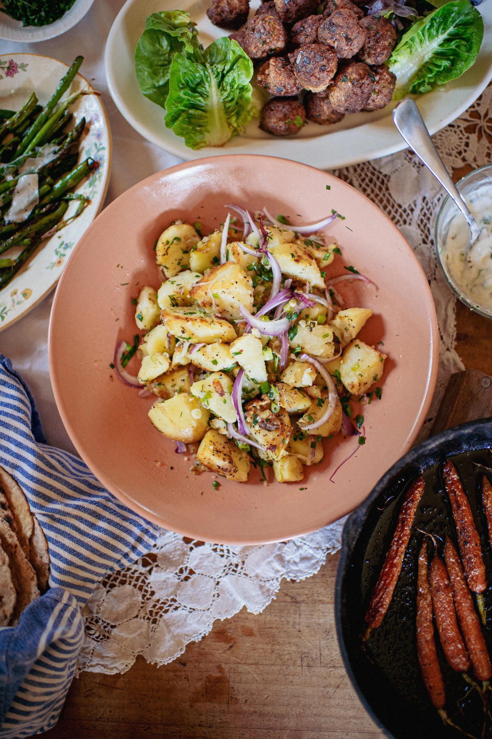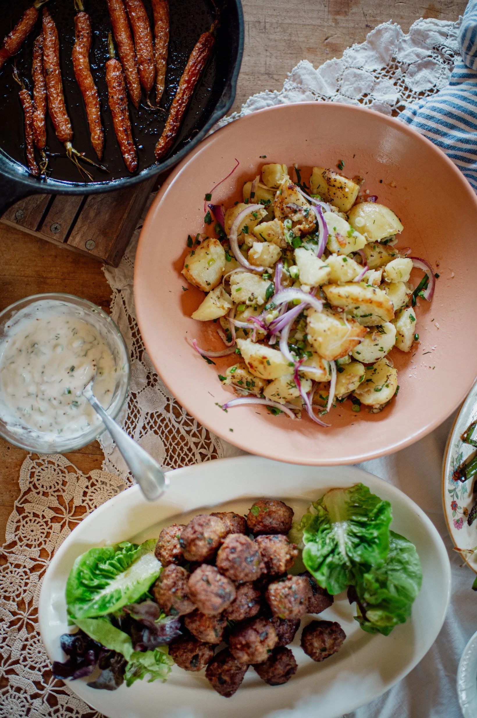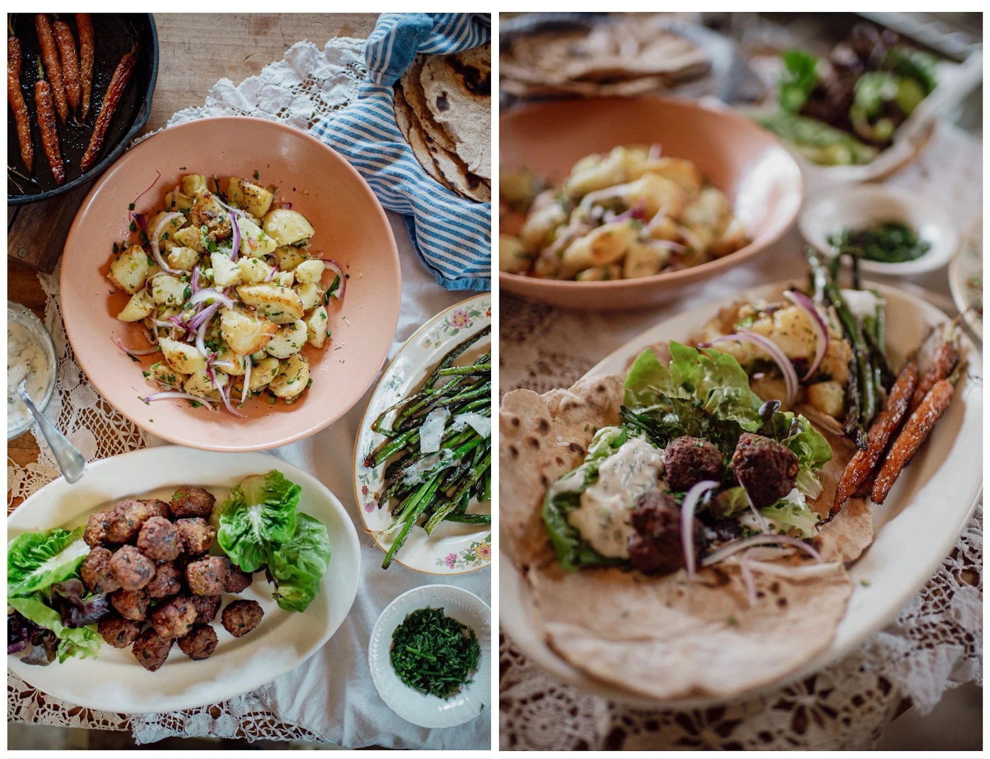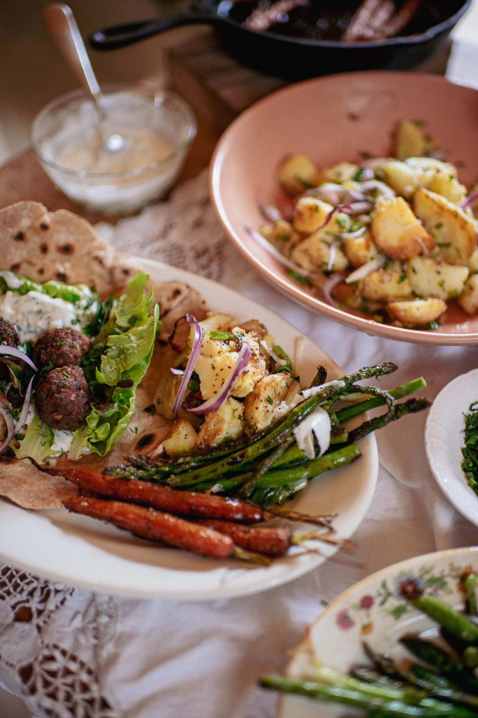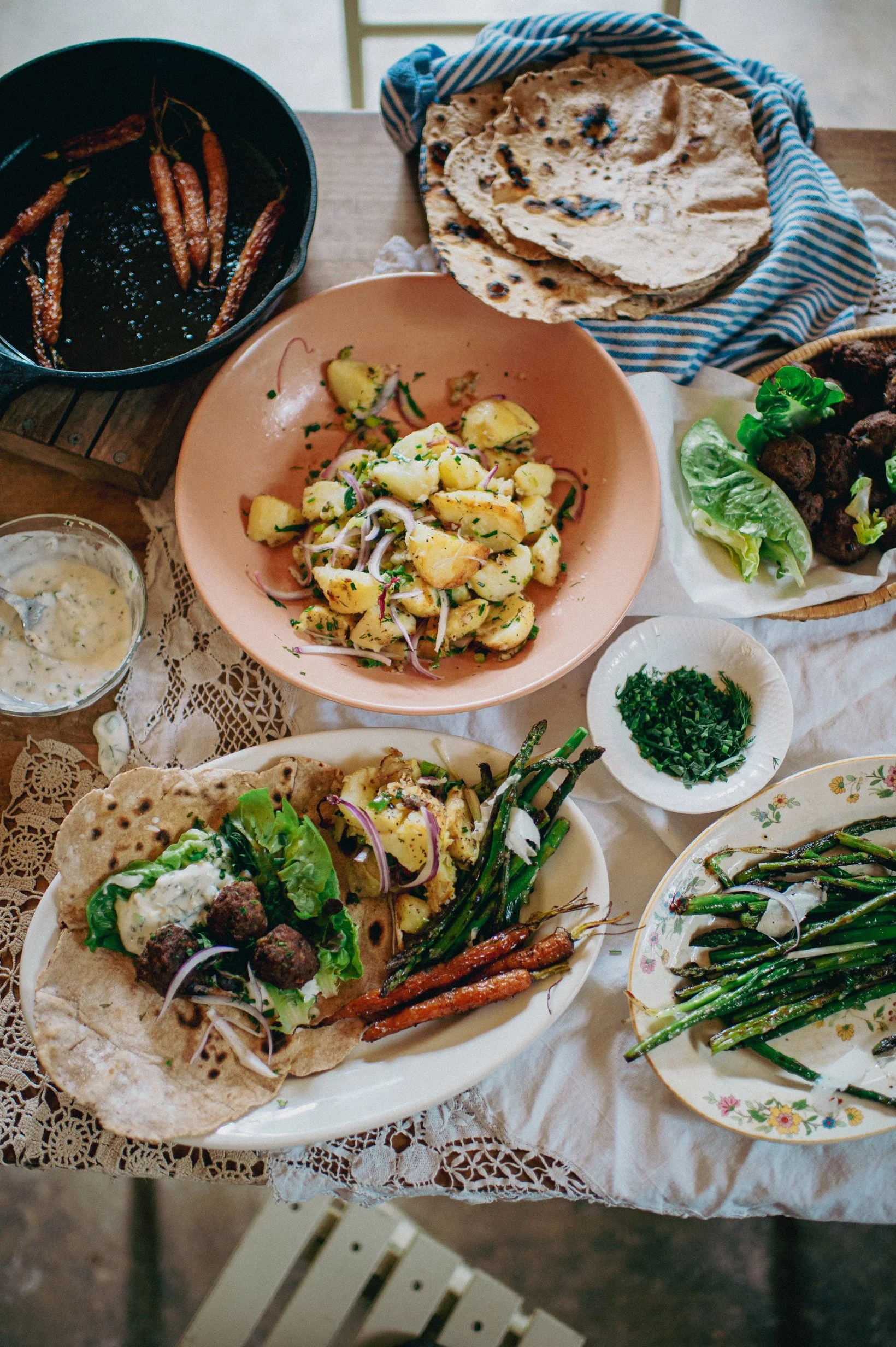 A SPRING MEAL: TANGY FLATBREAD: LAMB MEATBALLS: YOGURT SAUCE: NEW POTATOES WITH OLIVE OIL AND LEMON: ROASTED BABY CARROTS: GRILLED OR SAUTEED ASPARAGUS WITH SCALLIONS