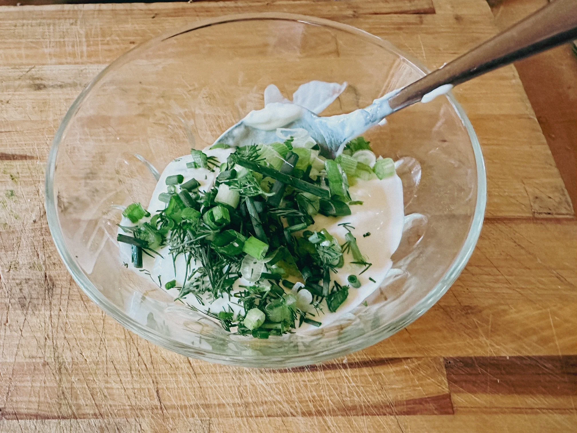 Some plain yogurt in a bowl. Add some scallions, dill and chives. A clove or two of garlic chopped fine. Salt and pepper to taste. A squeeze of lemon juice.