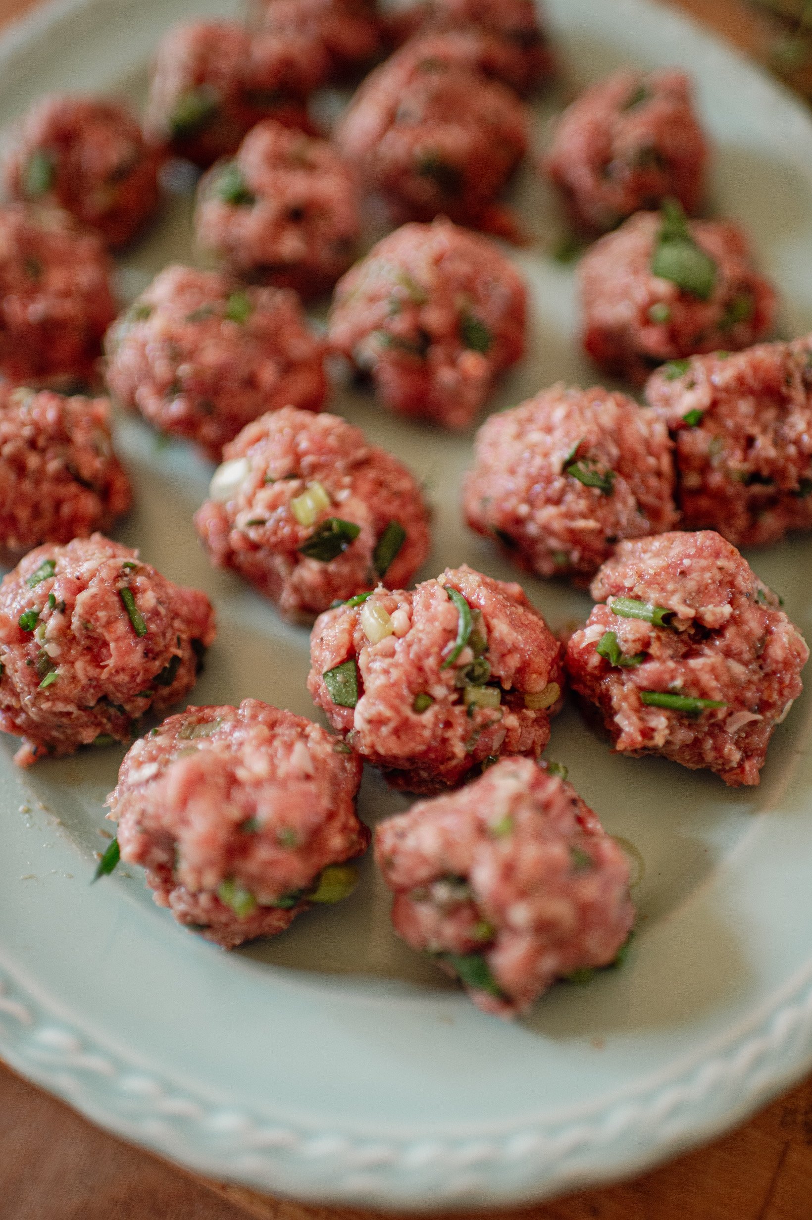 BREAK APART THE GROUND LAMB IN A BOWL GENTLY. MIX IN THE SCALLIONS, HERBS, SALT, CAYENNE, CUMIN, BREAD CRUMBS AND WHITE WINE. GENTLY WHISK THE EGG IN A BOWL WITH A DASH OF OLIVE OIL. POUR EGG OVER LAMB AND MIX GENTLY UNTIL COMBINED. SHAPE LAMB MIXTURE INTO SMALLISH BALLS AND CHILL UNTIL READY TO COOK.