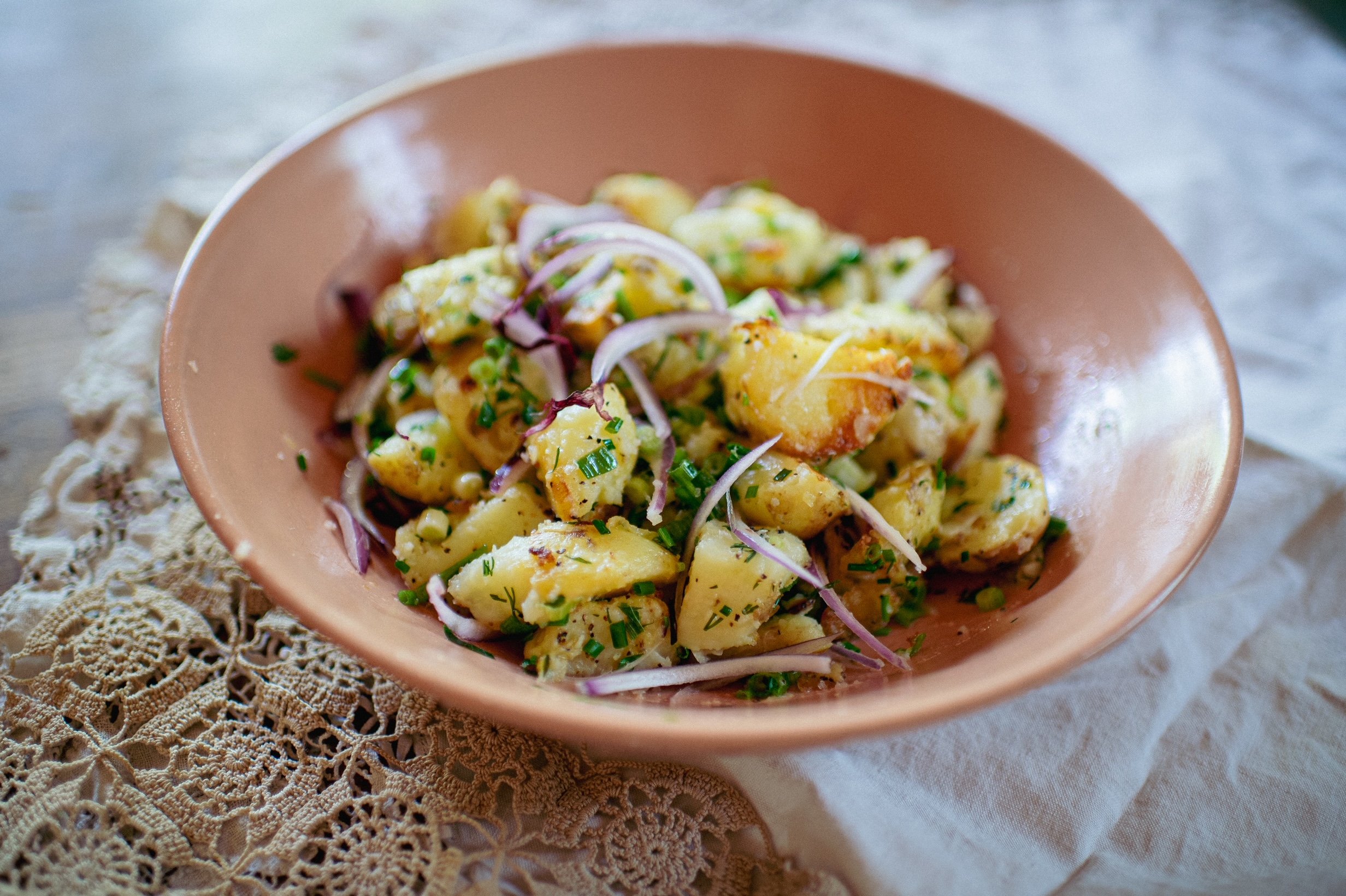ROUGHLY SKIN POTATOES. BOIL POTATOES UNTIL SOFT AND TENDER. REMOVE FROM POT AND CUT INTO CUBES. IN A SKILLET, HEAT SOME OIL. GIVE THE POTATO CUBED A QUICK FRY ON THE STOVE TO CRISP UP THE EDGES. CHOP YOUR SCALLION, RED ONION AND HERBS. MIX POTATOES AND HERBS TOGETHER IN A BOWL. SEASON WITH SALT AND PEPPER. SQUEEZE IN THE LEMON JUICE. ADD A FEW GOOD DASHES OF THE OLIVE OIL. MIX AND TASTE. EAT WARM, ROOM TEMPERATURE OR CHILL BACK FOR LATER.
