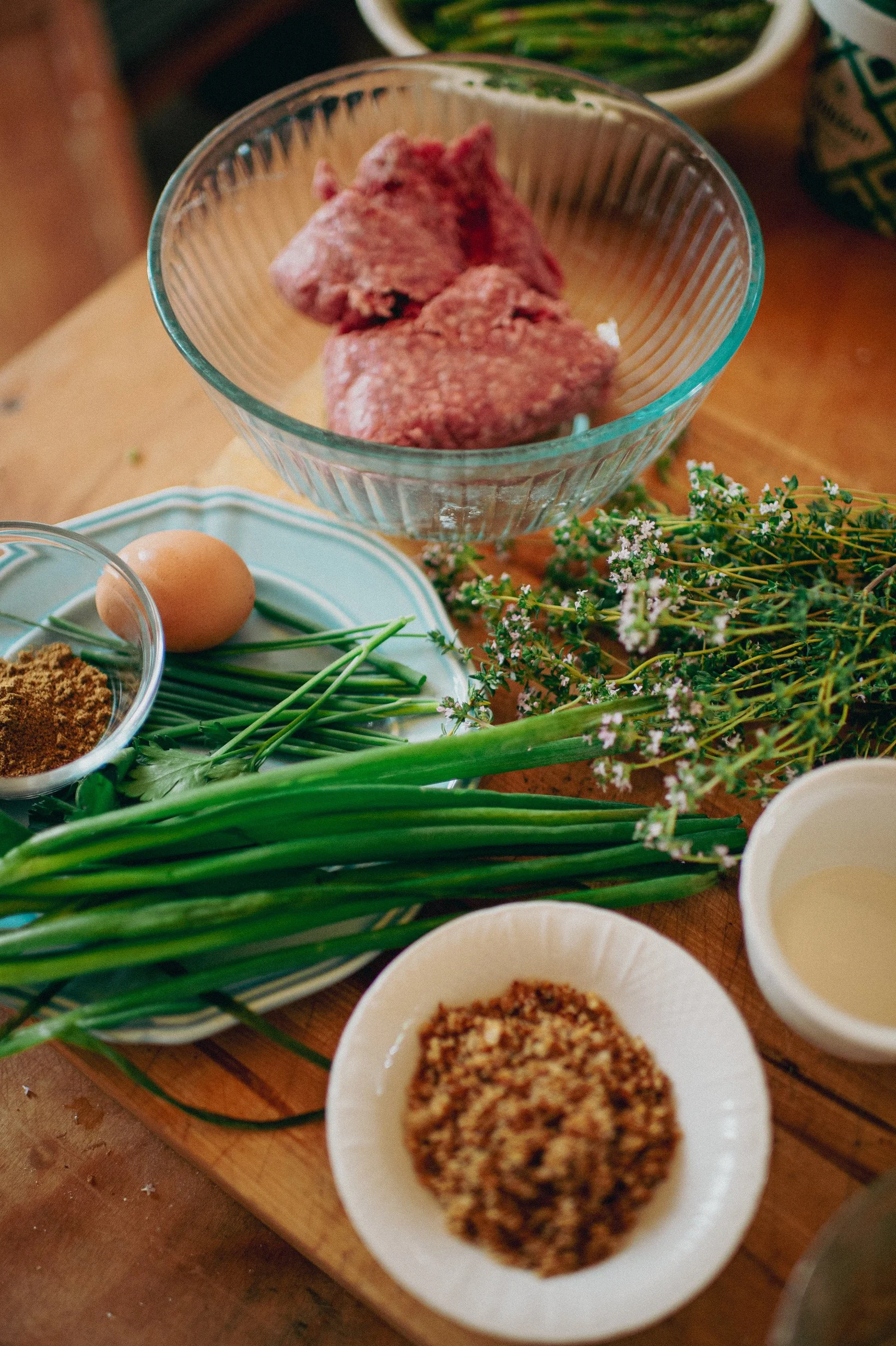 1 POUND GROUND LAMB, 4 SCALLIONS FINELY CHOPPED ( I USED THE BOTTOM BULBS AND HALF WAY UP THE GREEN STEM), CHOPPED HERBS (PARSLY, CHIVES, THYME, DILL AND MINT), 1 TEASPOON GROUND CUMIN, 1/2 TEASPOON CAYENNE PEPPER, 1 1/2-2 TEASPOON SALT, 1 TABLESPOON WHITE WINE, 1/4 BREAD CRUMBS, ONE EGG, EXTRA VIRGIN OLIVE OIL