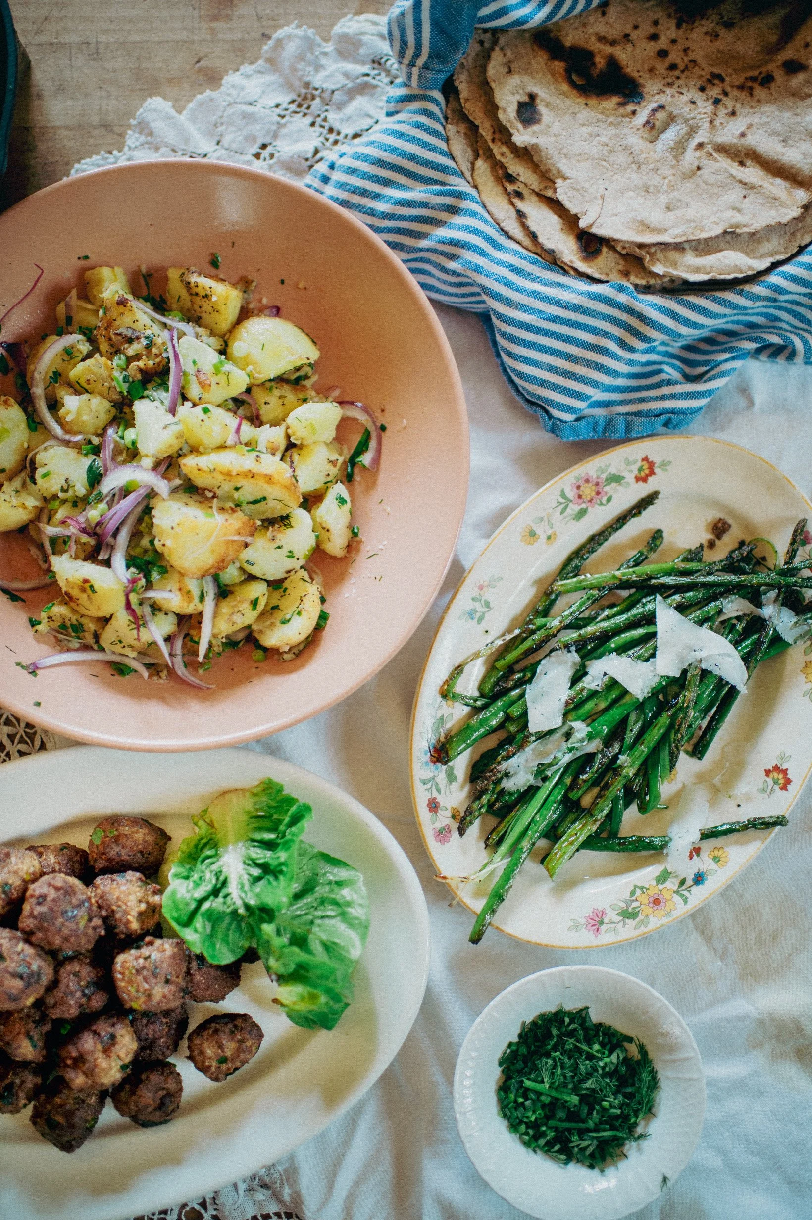 Curating a spring meal. I often find that spring meals can be very basic. When such beautiful and perfect things start to pop up in the garden it is easy to just plop them on a plate without too much fuss. They are often tender, sweet and fresh; like new beginnings.
