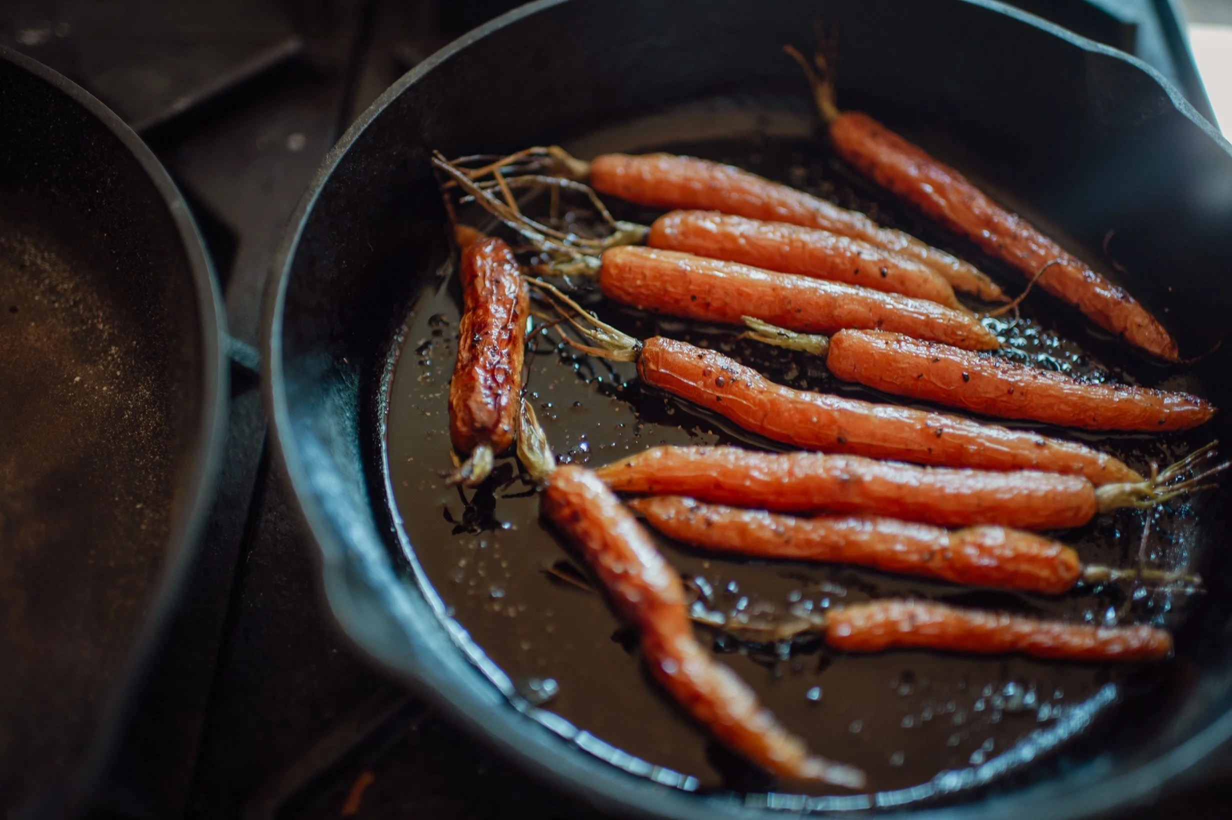 This is so easy it maybe doesn’t need an explanation. But for you reference. Baby carrots, from a garden or farmers market. Tops cut but it is nice to leave a little green at the top for aesthetics. Don’t peel because the skin is good for you with so many nutrients from the soil. Place in a cast iron skillet or on a sheet tray. Salt and pepper and olive oil. Roast at 400 degrees F until the carrots are caramelized and tender. They taste like candy.