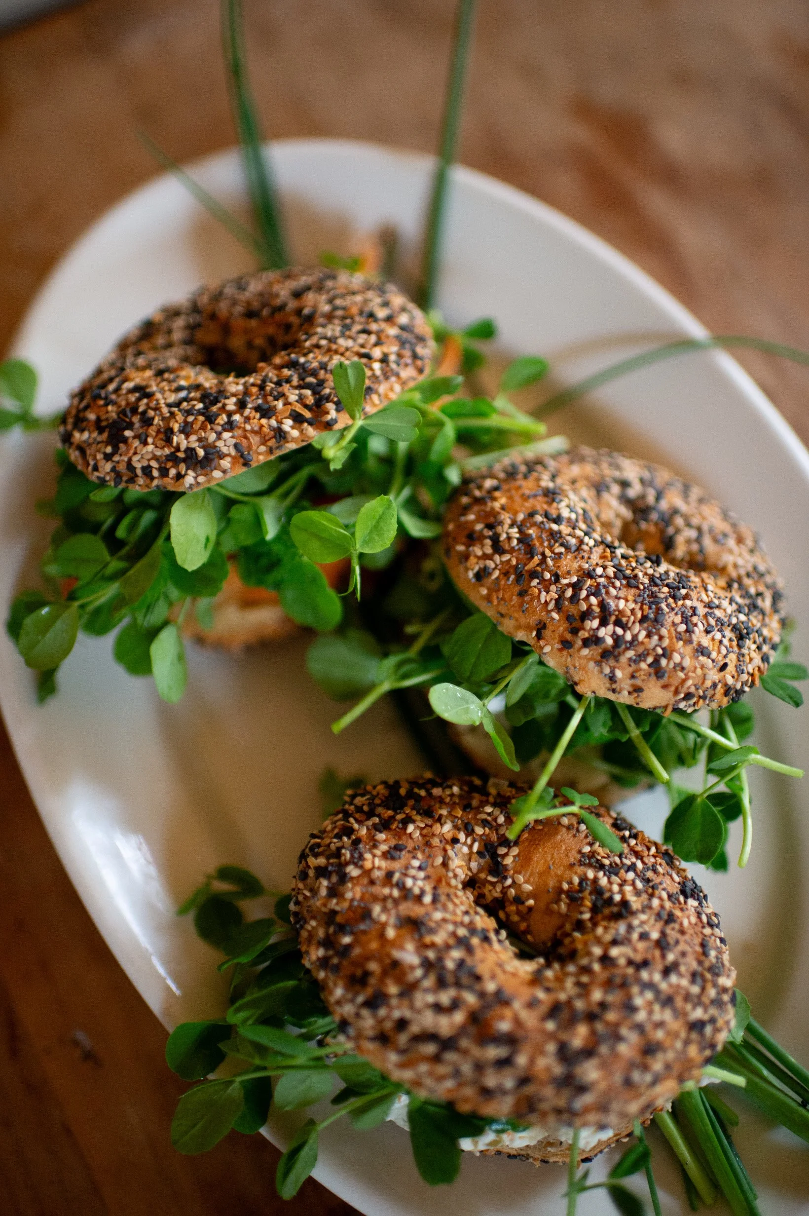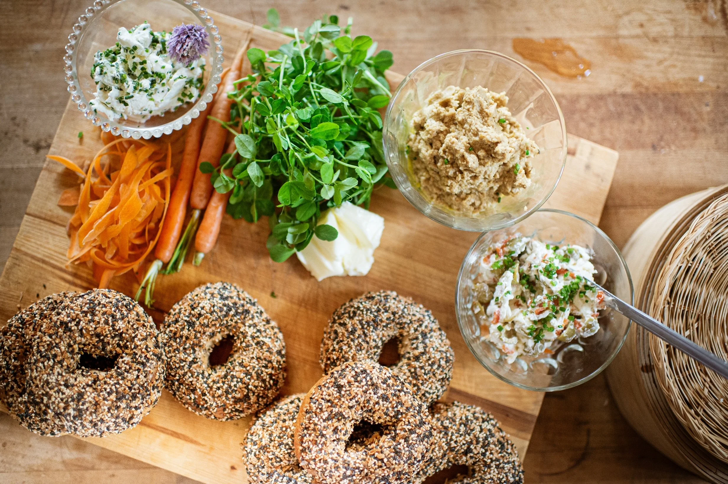MAKE A BAGEL SANDWICH WITH HUMMUS AND HOMEGROWN PEA SHOOTS