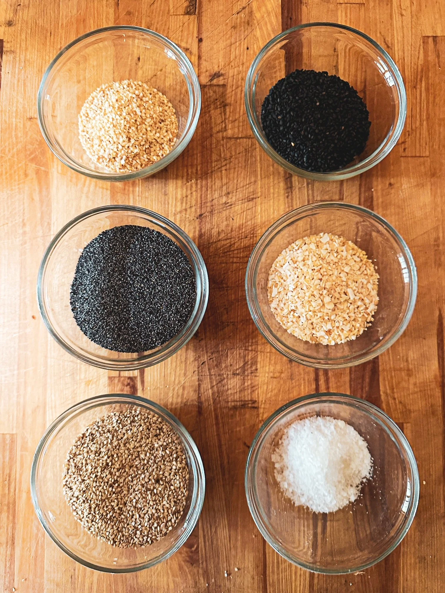 MAKE EVERYTHING BAGEL MIX: sesame seeds, black sesame seeds, poppy seeds, minced dry onion, minced dry garlic and flaky salt. Mix together in a bowl.