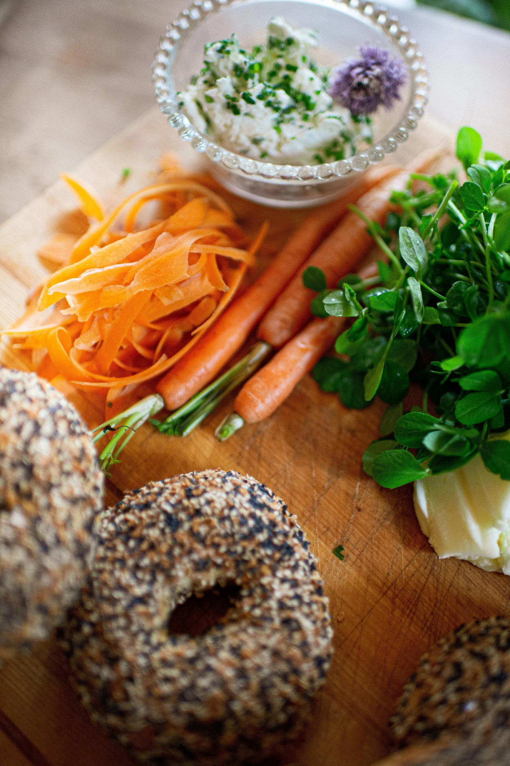 For the sandwich slice your bagel in half, spread with hummus, top with thinly ribboned carrots, feta cheese and a large handful of pea sprouts. It the summer I might do a top layer spread of fresh basil pesto because it makes it even that much better!