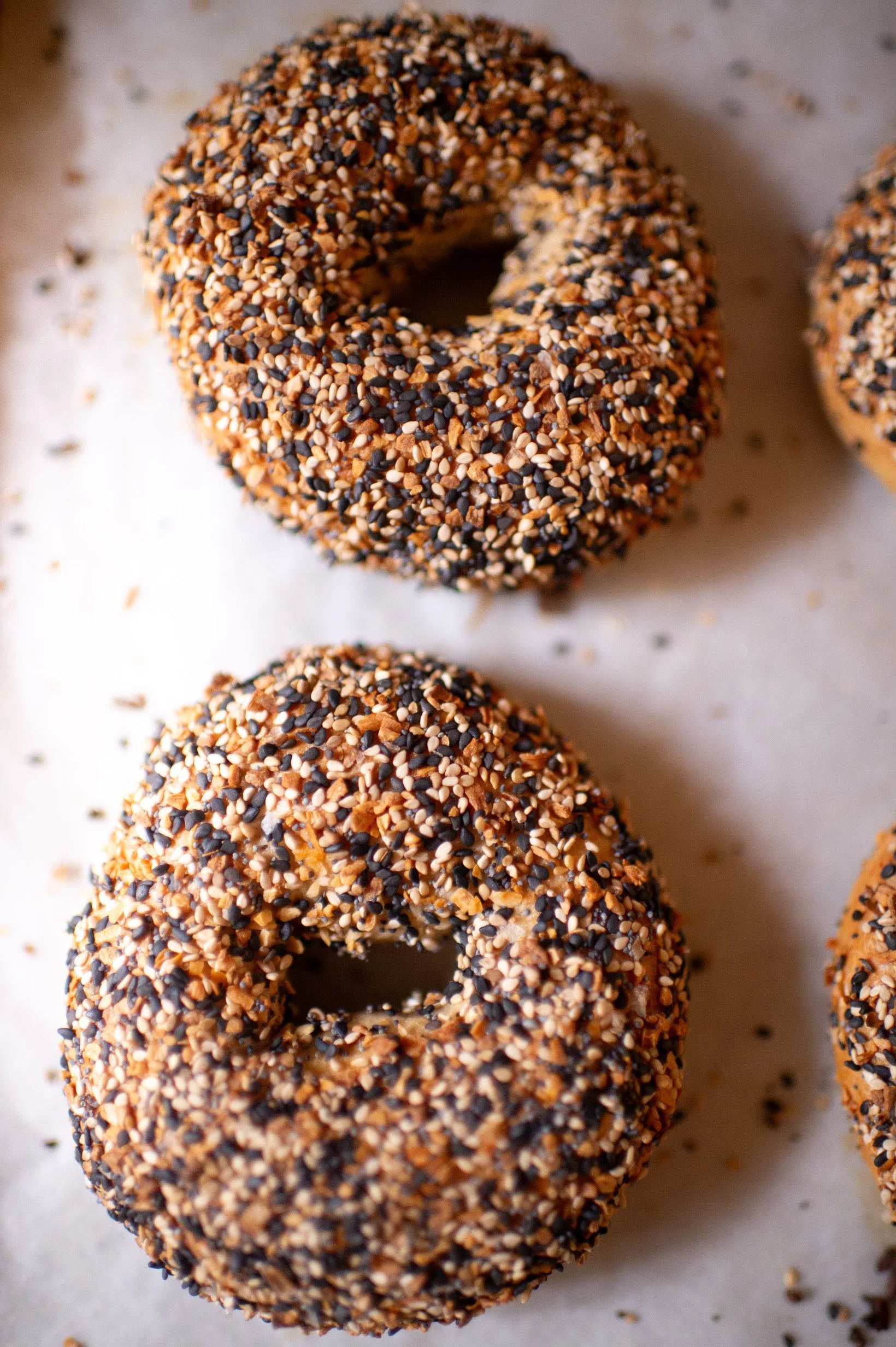 Remove bagels onto a metal cookie cooling rack and while still wet drop them face first into the bowl of EVERYTHING SEEDS and cover generously. Place back on parchment lined sheet tray.