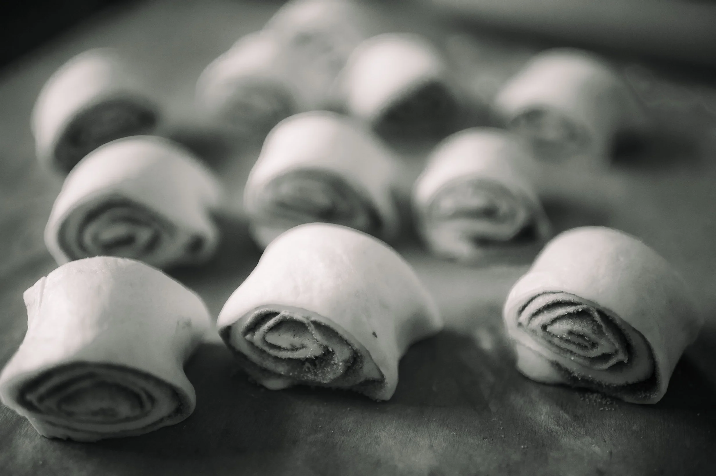 Punch down the dough and roll it out ( as illustrated in the video below). Roll it in a rectangle to roughly 1/4 thick. Brush melted butter over the dough and then dust with the cinnamon sugar (1 cup sugar to 2 tsp cinnamon). Roll the dough into a long spiral roll from the bottom up, ending with the seam side down. Cut the rolls 1/2 inch thick.