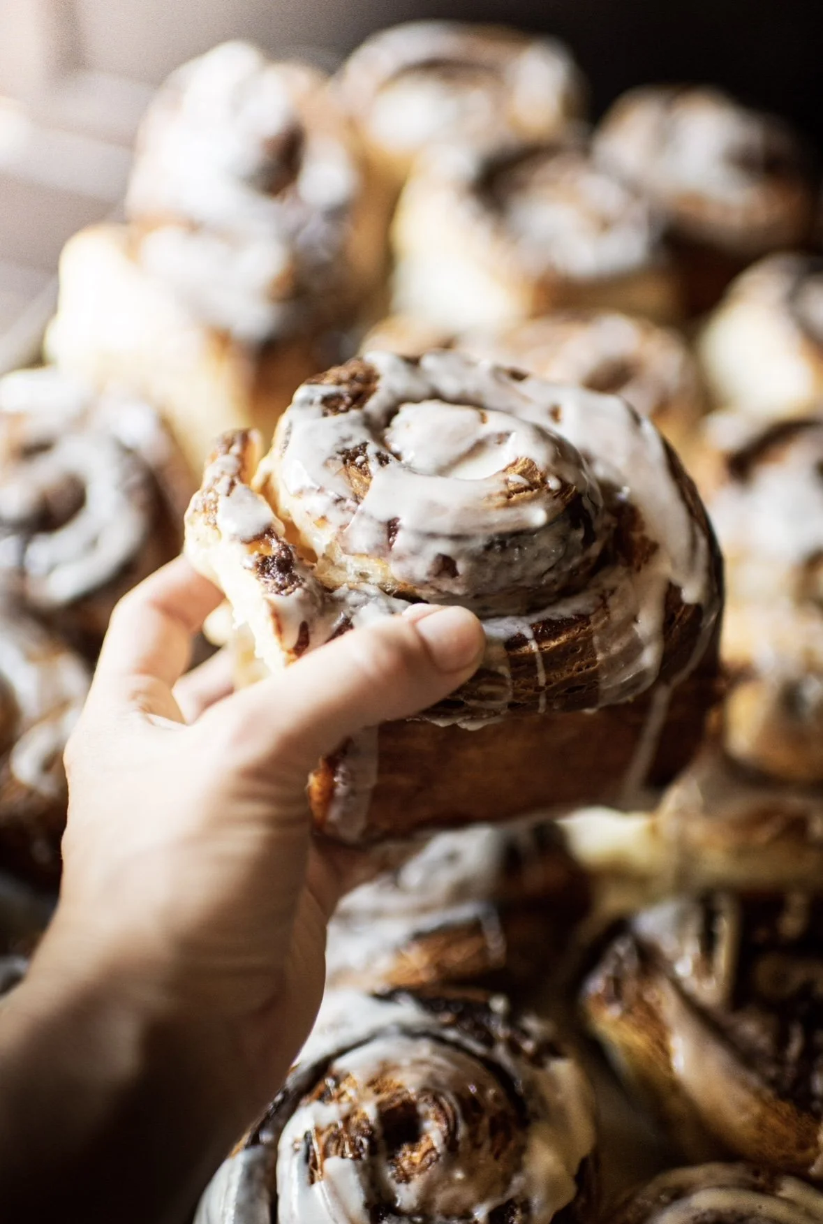 The croissant dough should be made a day or two before shaping the rolls. The rolls can be shaped in the evening and chilled over night for an early morning bake. Once they are pulled from the fridge, let them warm and proof for a couple of hours before baking. I usually egg wash the top of the rolls before baking. Bake at 400 degrees F. If you find that the rolls are starting to burn slightly on top then drop the temp of the oven to 375 or 350 or cover them with tin foil. These rolls are cut at around 1 1/2 inch wide before traying. Let them cool before glazing. These rolls freeze incredibly well and last for up to a few months in the freezer. Warm them up in a 350 degree f oven until soft.
