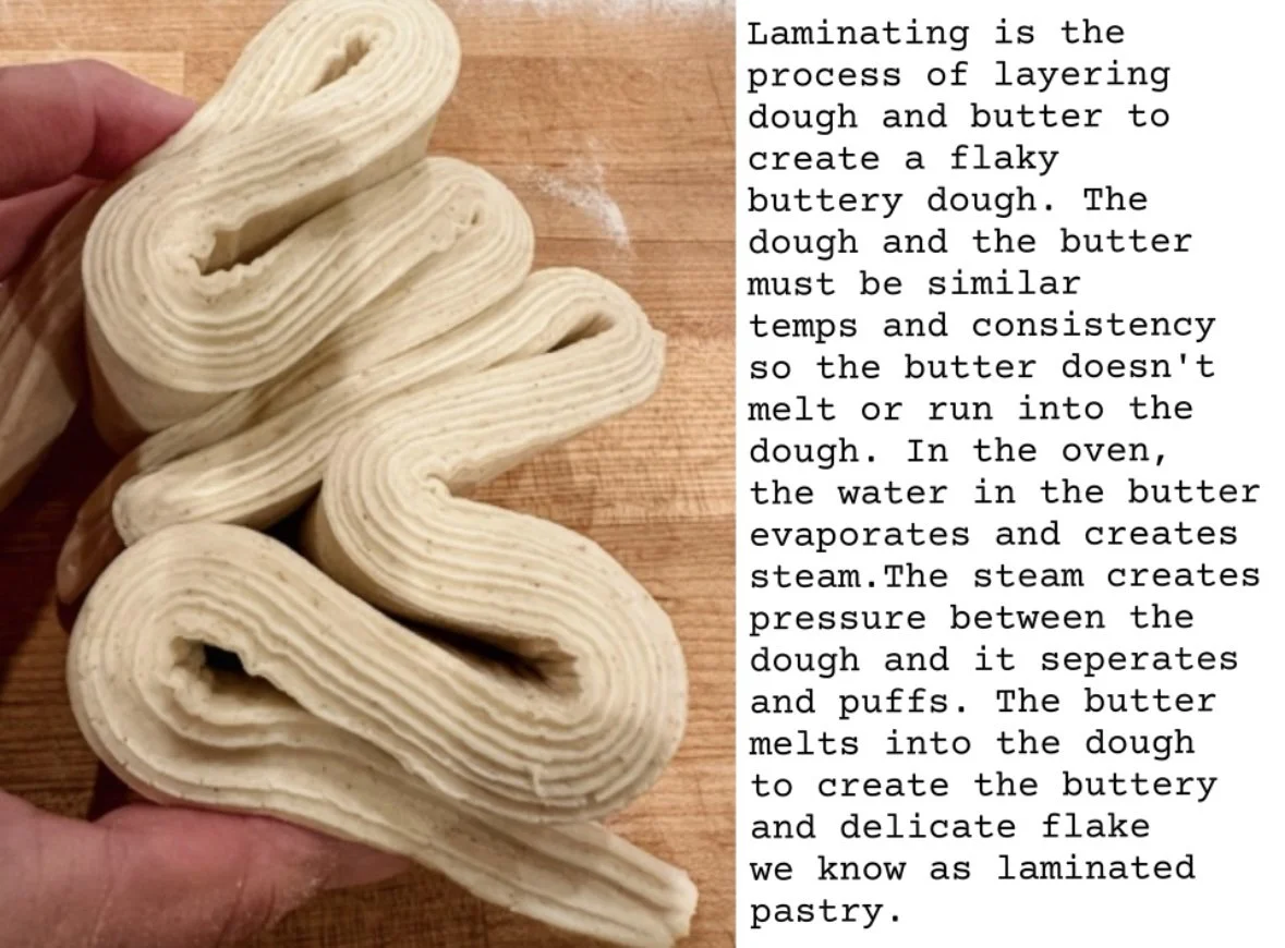 Lamination is the process of layering the butter into the dough. This process will take a couple of hours as the dough will have to be chilled back for roughly one hour after every turn. We will be doing 3 turns of our dough to develop the desired layers of dough and butter.