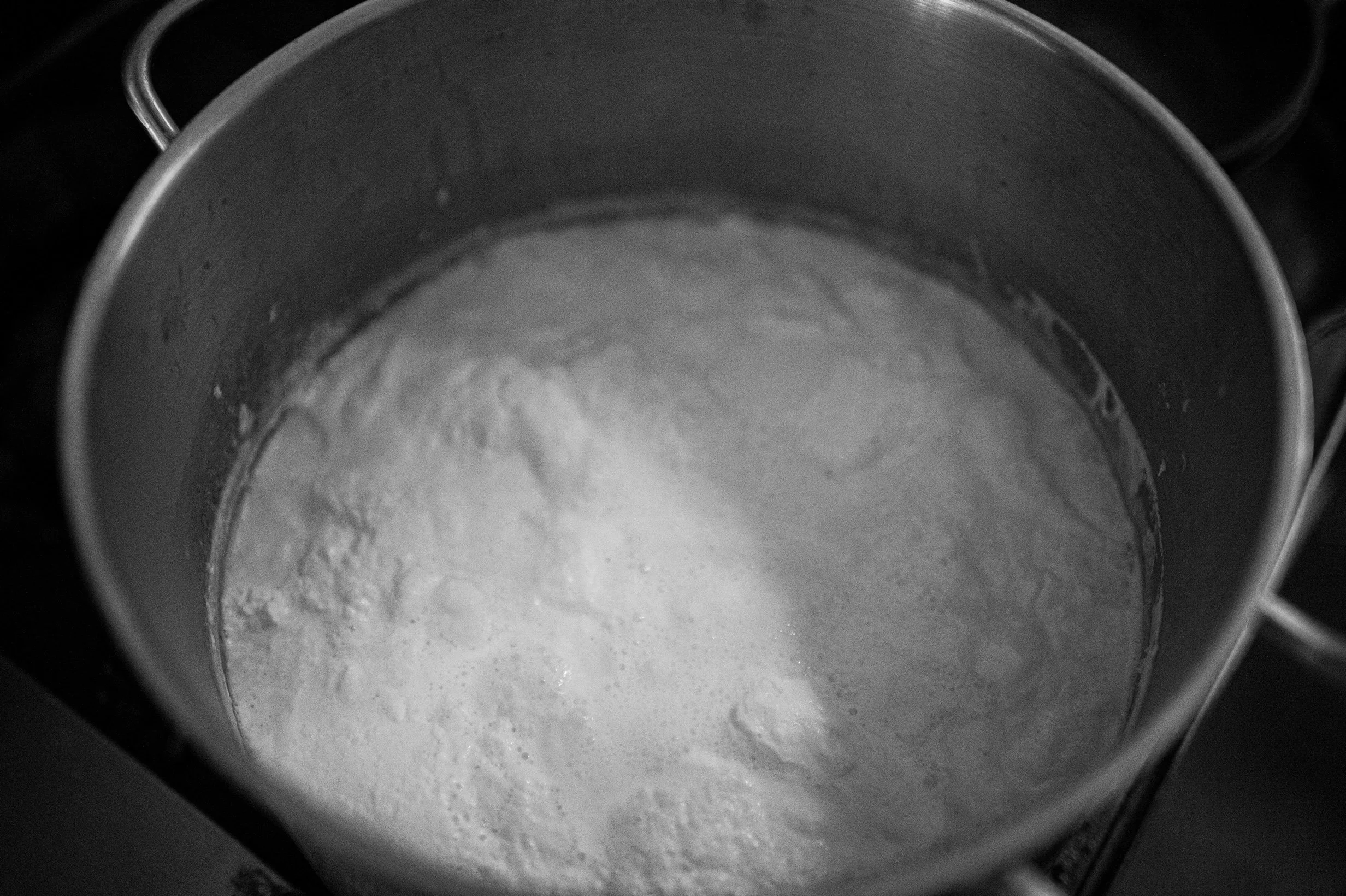 - whisk together the milk, cream, lemon juice and 1 teaspoon salt in the pot. Put on the stove over medium low heat. Slowly heat the milk to 185-195 degrees F, stirring occasionally with rubber spatula so as not to scald the bottom.
