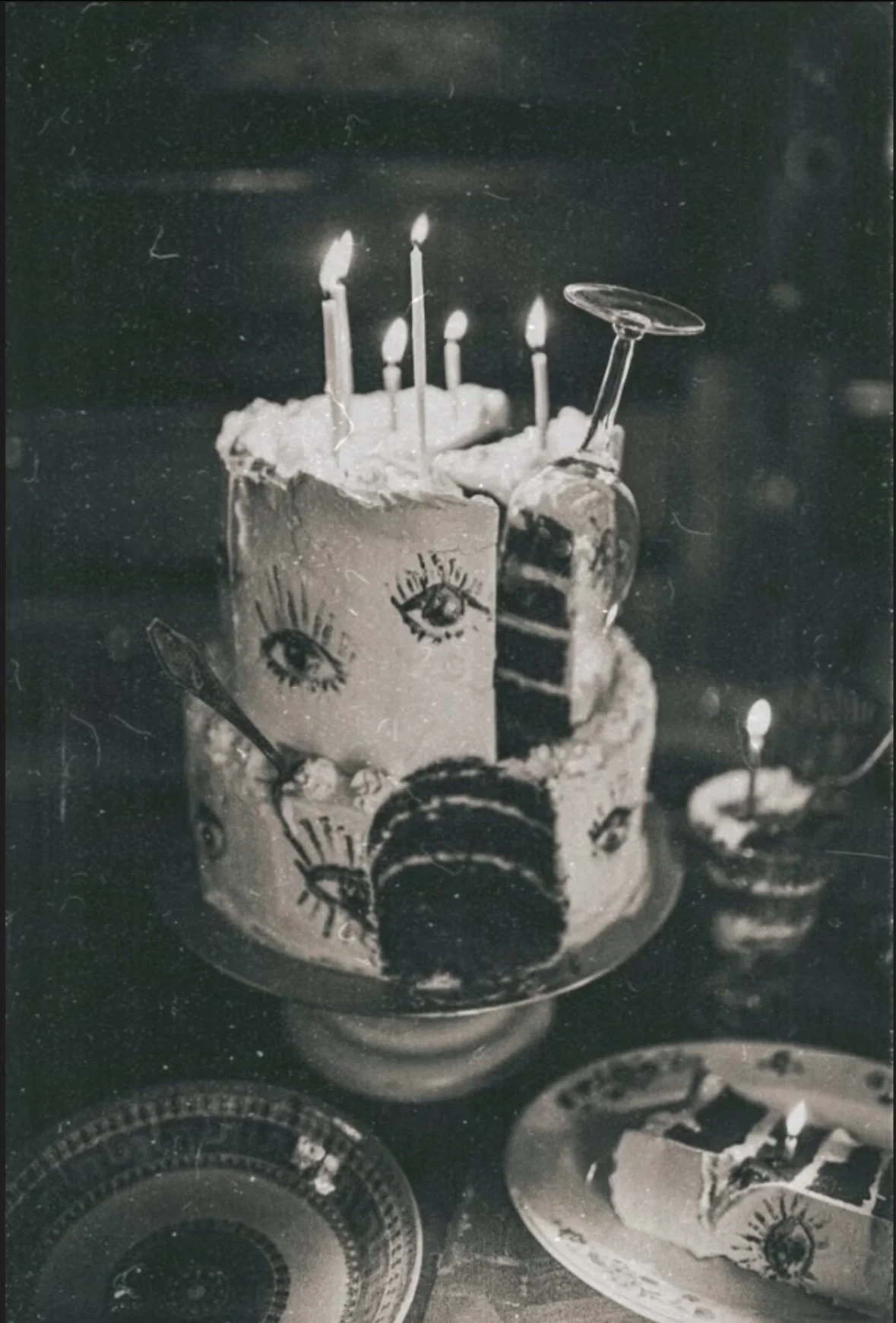 So I made a cake for myself. I made a chocolate cake for myself. I painted eyes in black icing. It became a companion at the table. I delicately sliced a piece. I scooped a piece with a wine glass, I dug at it directly with an old antique spoon. I put a mess of candles on top. It was chocolate and it was surreal in the rainy day gloom of my shop as the candles lit the room at noon like it was midnight instead. November is for chocolate and twisting that which we know into things that we don’t know…..just to see what happens.