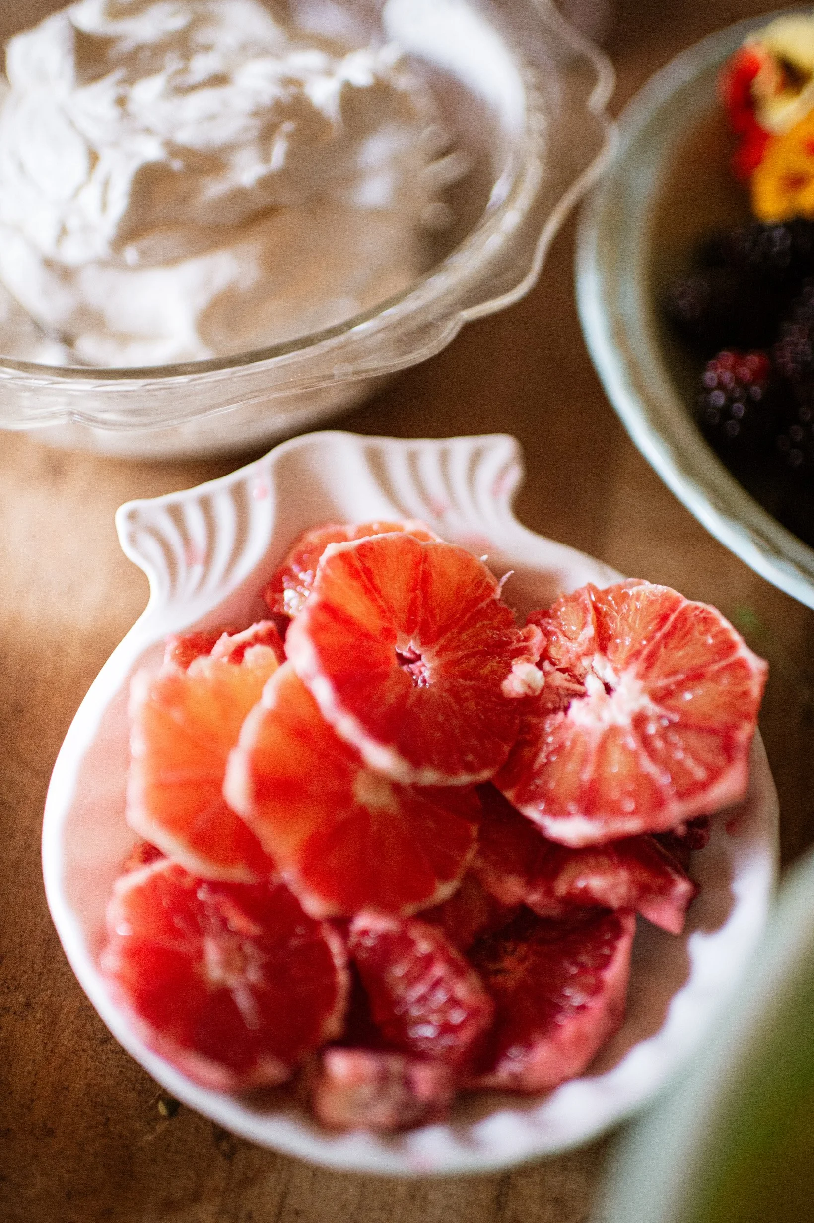 I have imagined for years that one day a winter storm might bring snow low enough….down the mountains into the valley and over the citrus orchards. I have imagined standing beneath a tree with a fresh picked orange dusted white and skin chilled. I picture myself peeling it. Slowly eating each piece. Snow on the ground and on the leaves. It never snows that low and it would not be good for the trees……but something about the thought of picking an orange off a snowy tree seems poetic. This pavlova with blood orange and blackberry is my ode to Snow and Citrus.