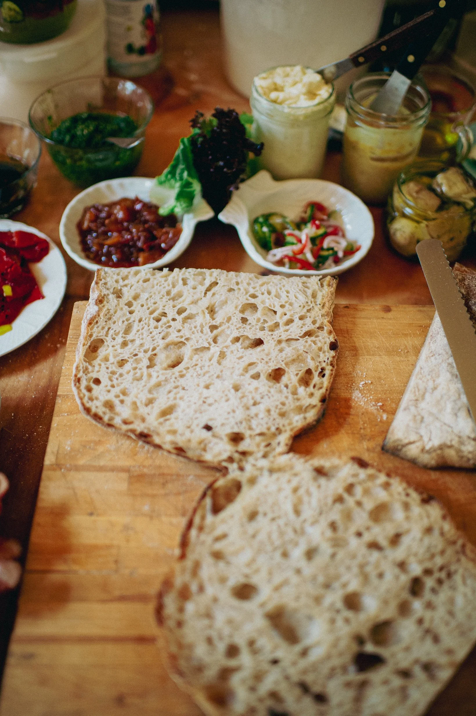 Below is a run through of some homemade sandwich condiments, along with a recipe for slab bread and some basic ideas about putting it all together. This is but a drop in the bucket of ideas but might get you thinking about sandwiches in a new light. Experiment, have fun and let me know what you come up with!