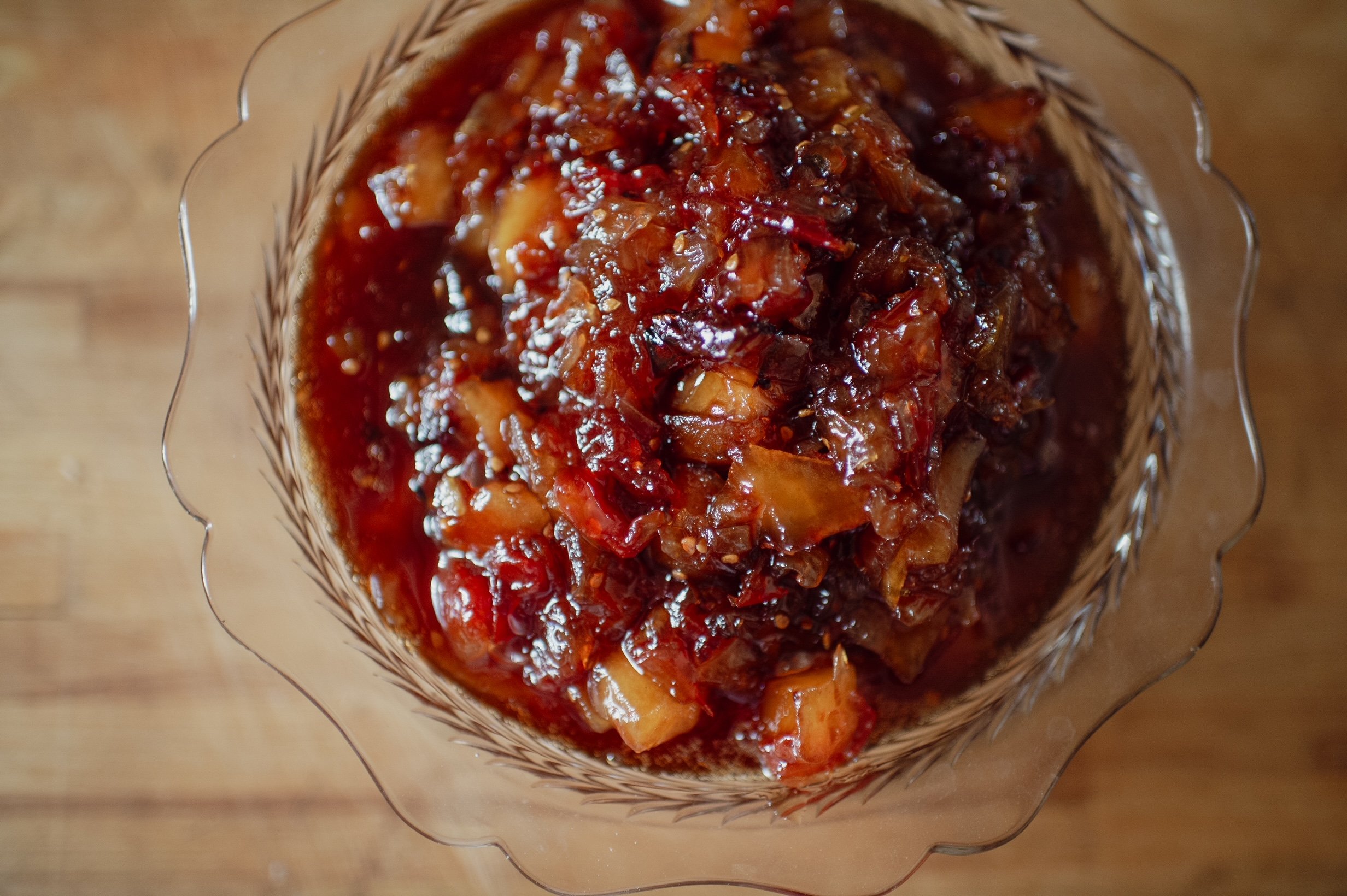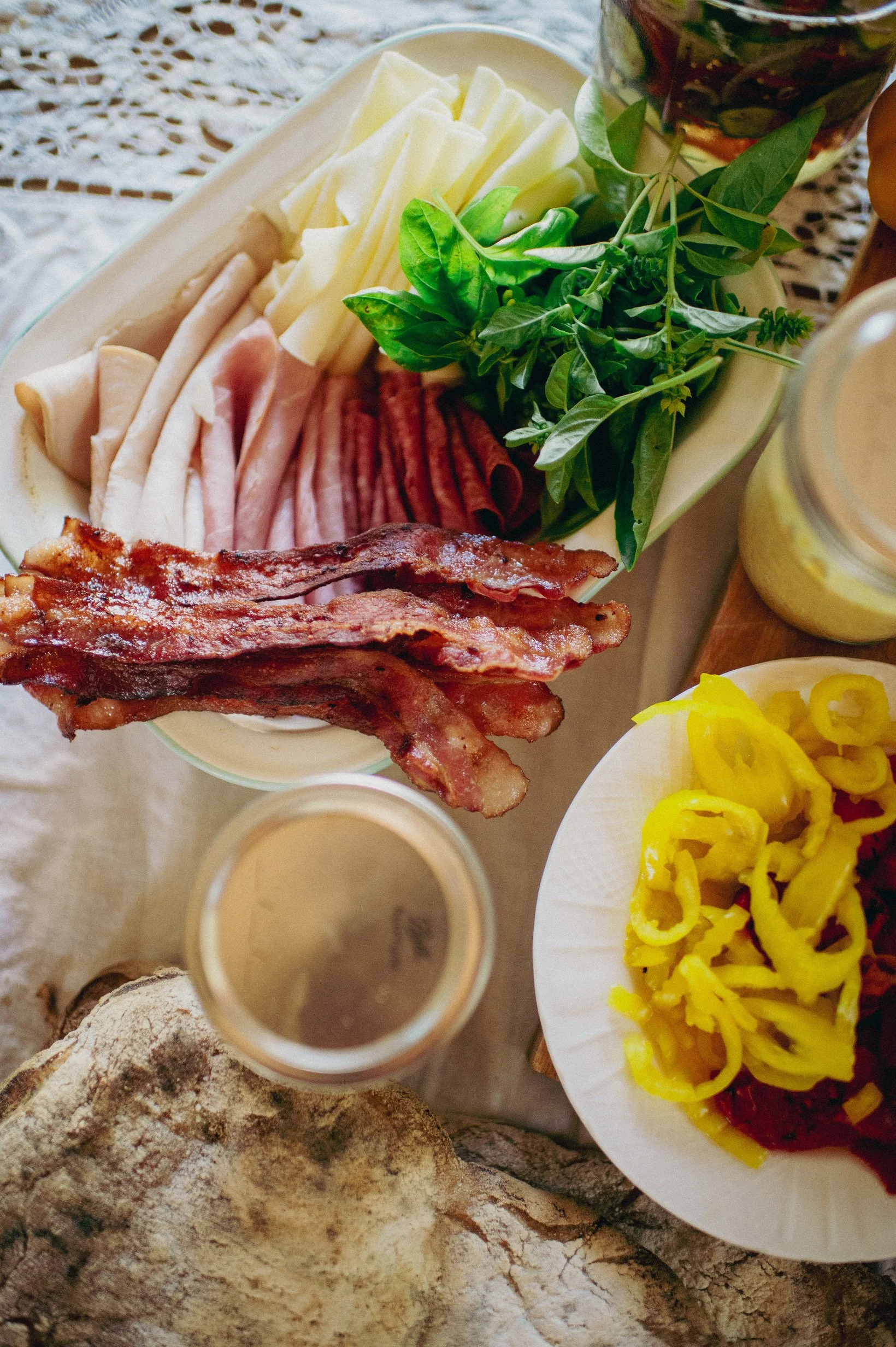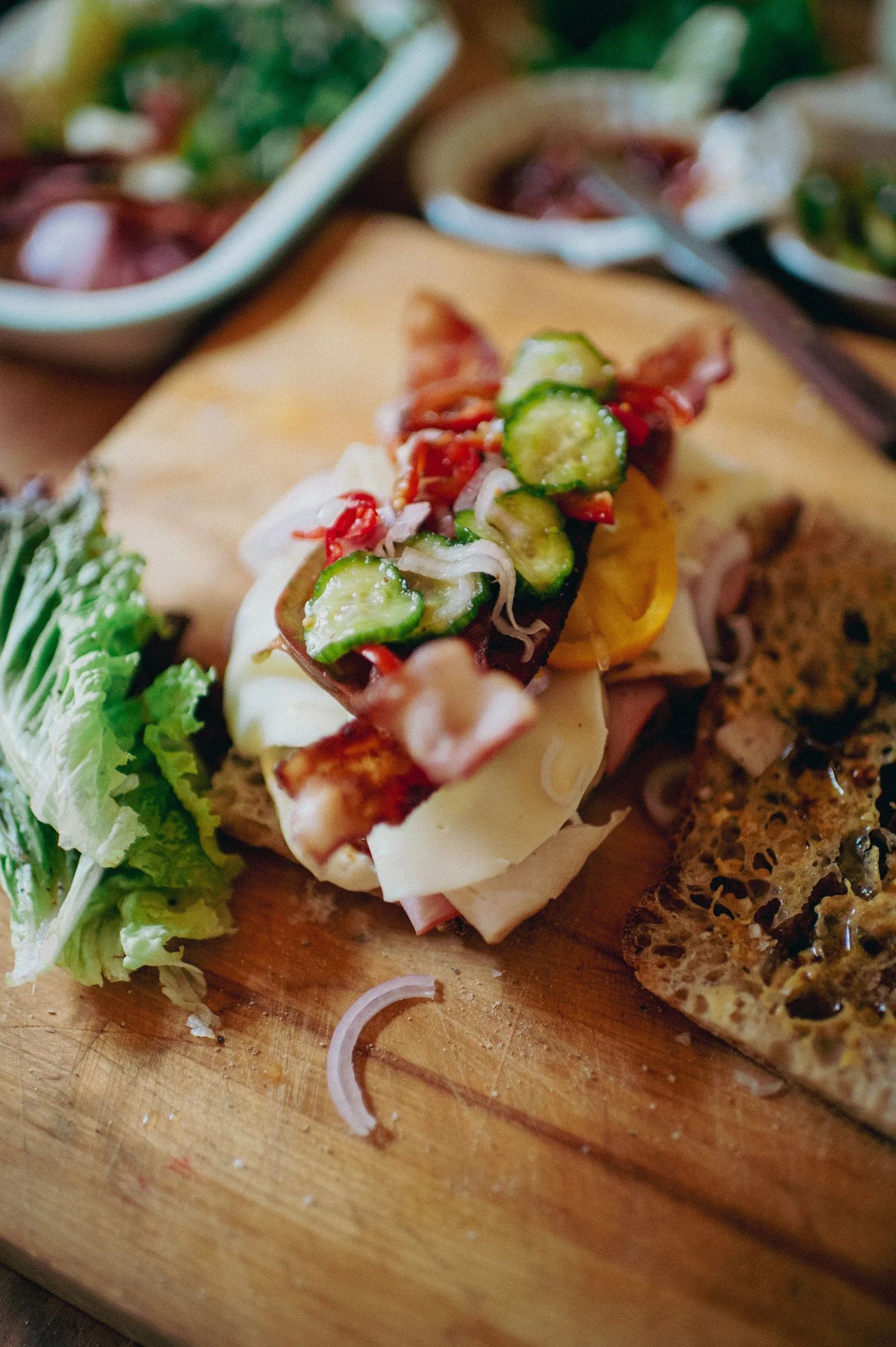 I spread one side of bread with the mayonnaise and mustard and the other side with the tomato chutney. Layer on the ham and turkey with a provolone cheese. Tomatoes and sliced shallots. Crispy bacon. Sweet pickles. Lettuce or pea shoots. A drizzle of oil and salt and pepper to taste. This might not be completely traditional with the chutney and the pickles but it is quite lovely getting creative.