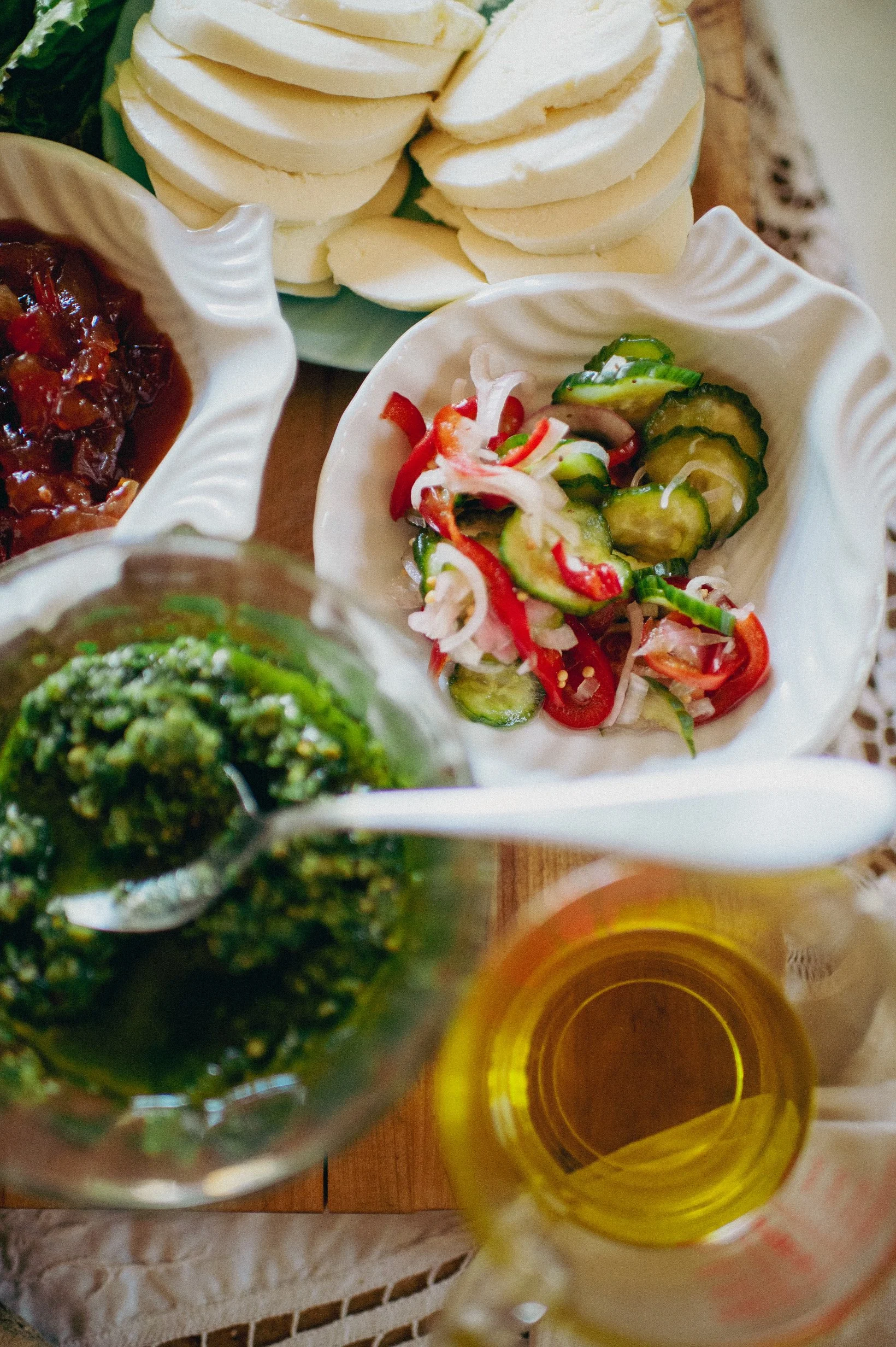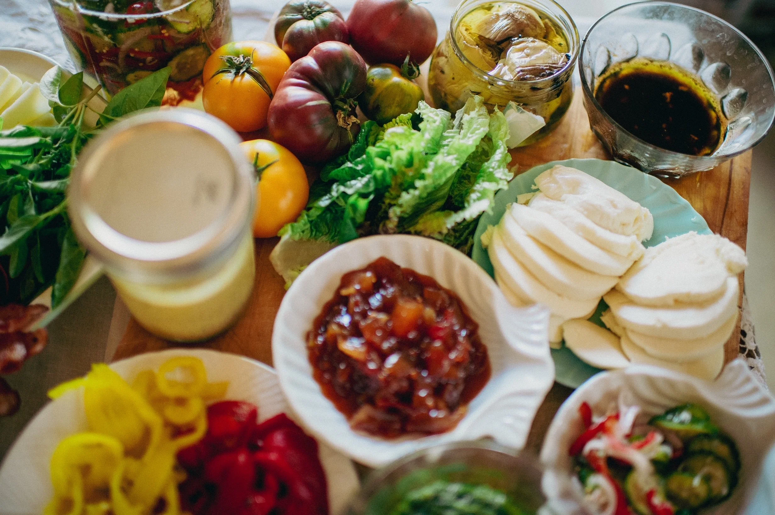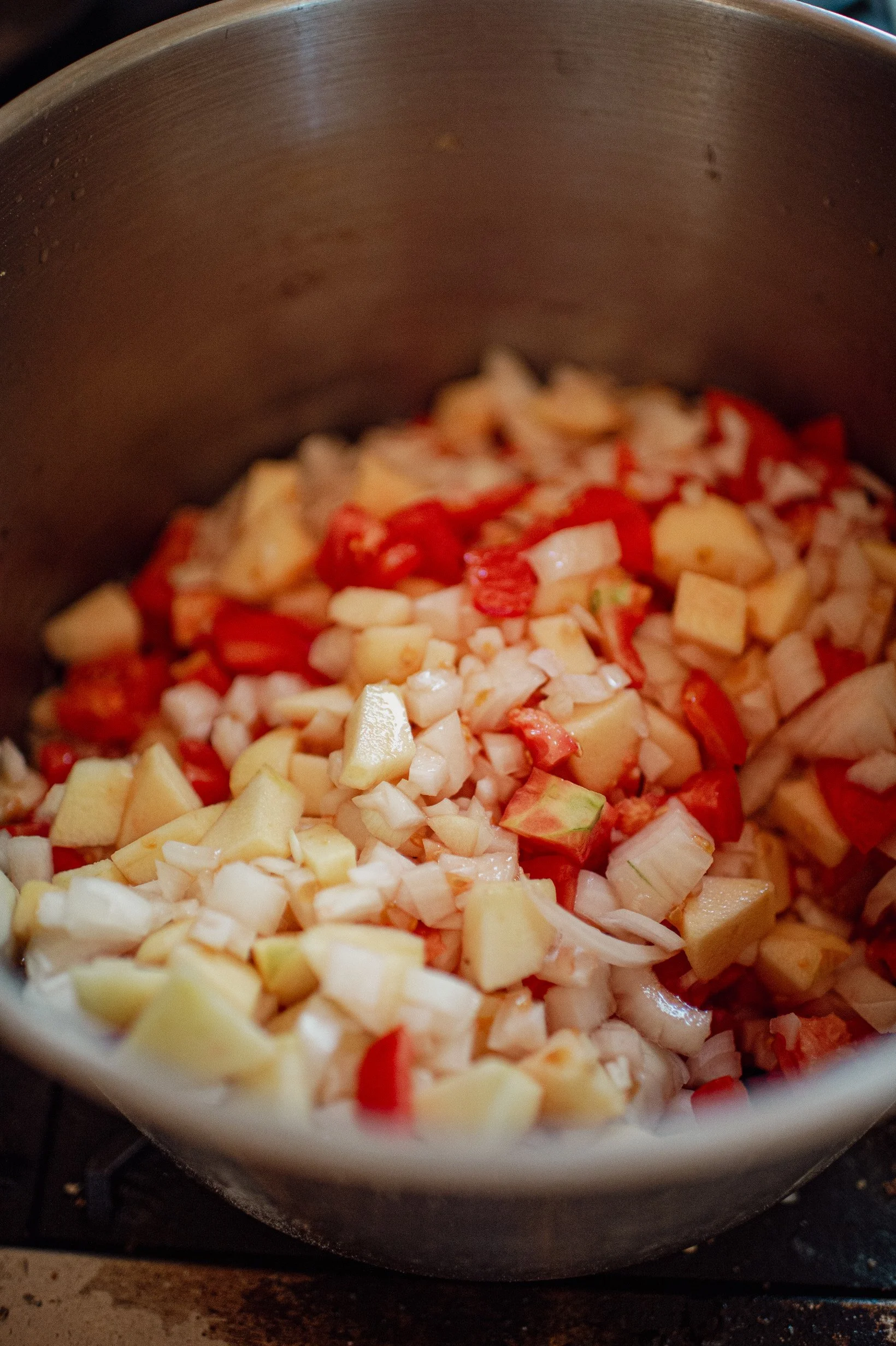 I spread one side of bread with the mayonnaise and mustard and the other side with the tomato chutney. Layer on the ham and turkey with a provolone cheese. Tomatoes and sliced shallots. Crispy bacon. Sweet pickles. Lettuce or pea shoots. A drizzle of oil and salt and pepper to taste. This might not be completely traditional with the chutney and the pickles but it is quite lovely getting creative.