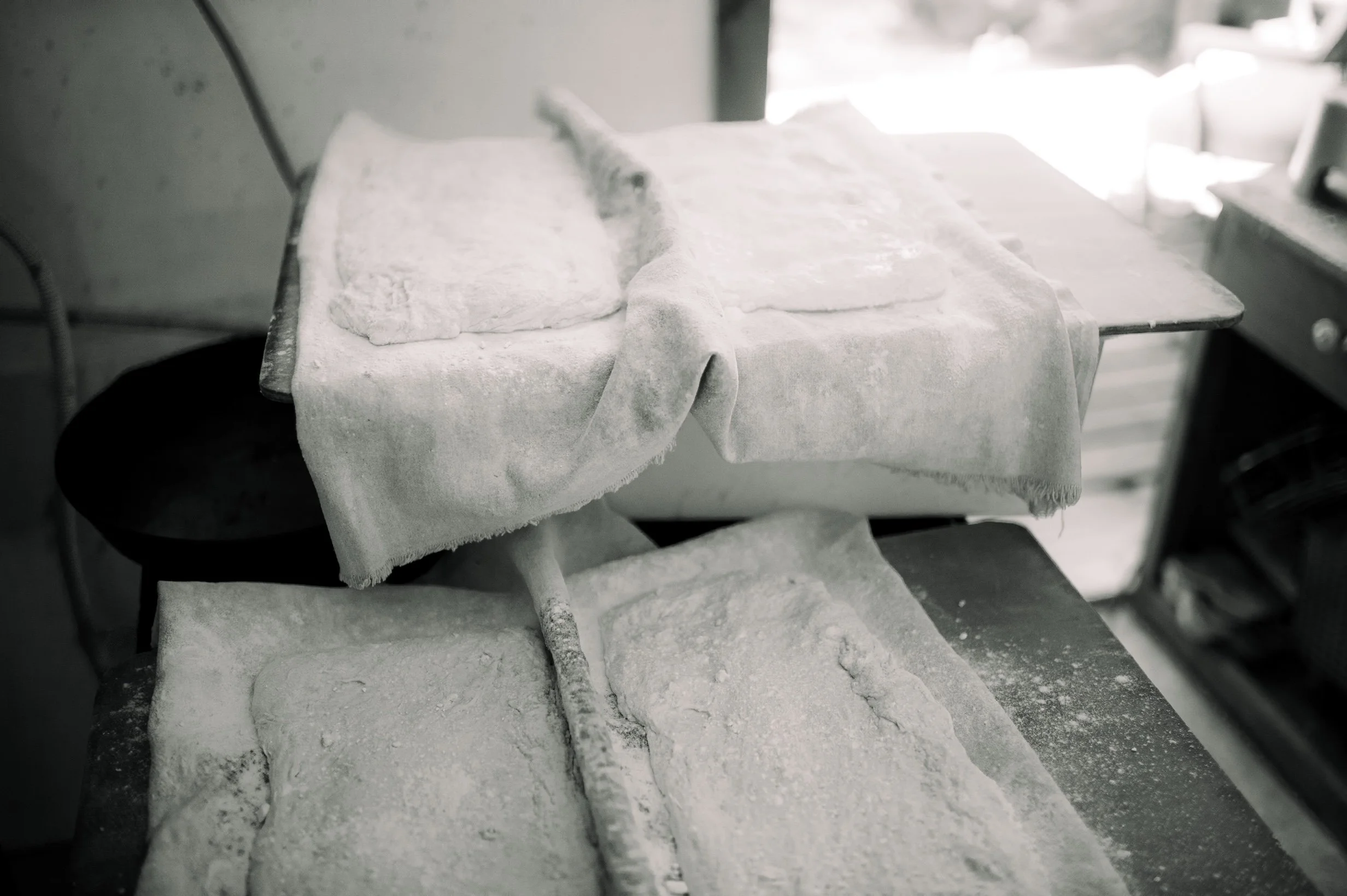 The following day you will shape and bake the bread. Follow the video tutorial below for shaping the slab bread and flipping it on the board to load into the oven.