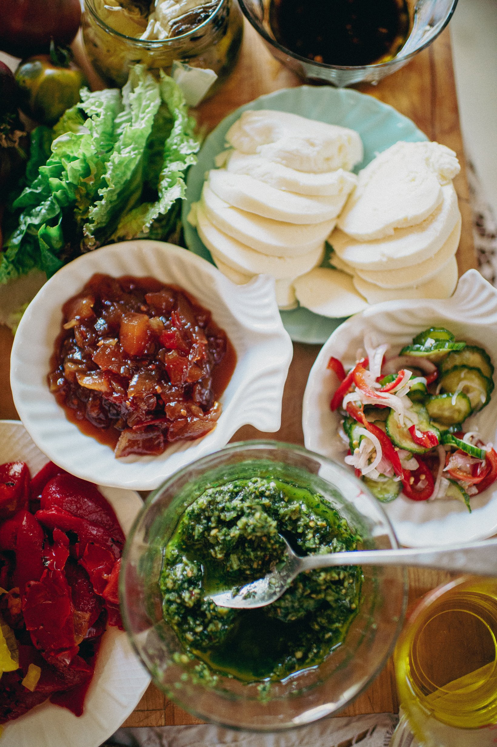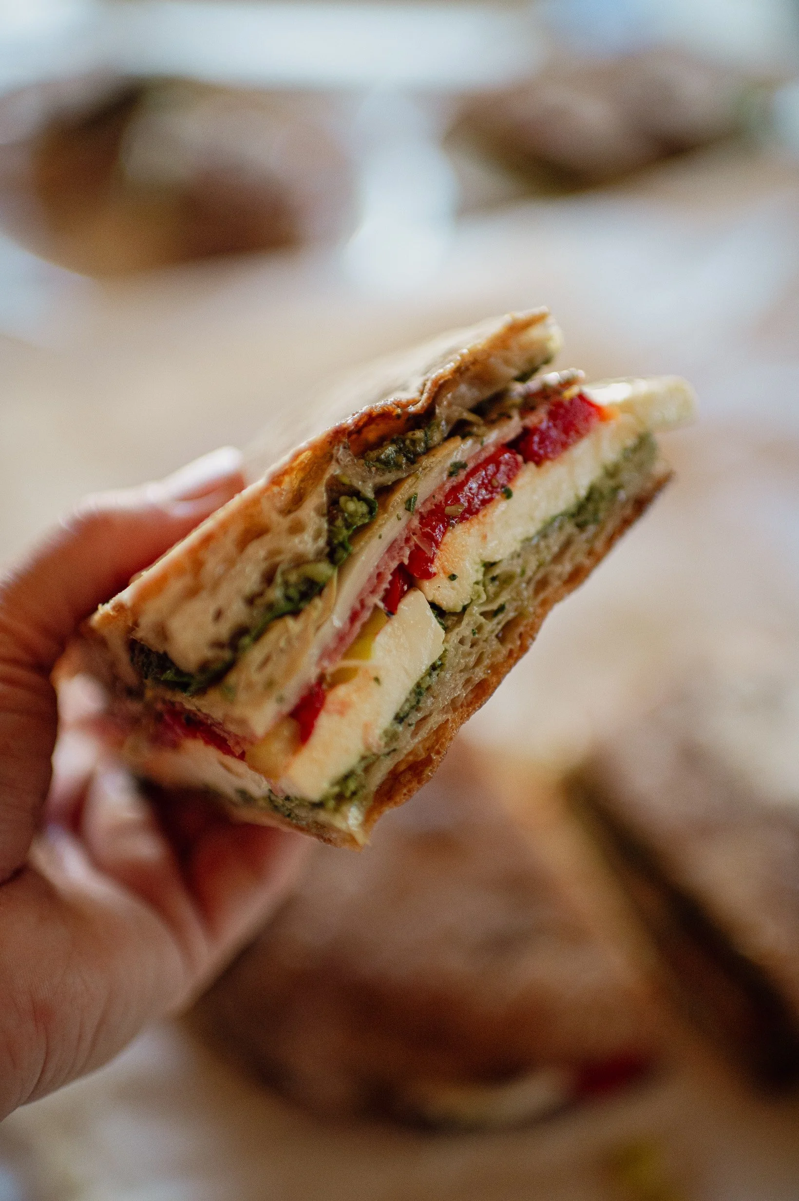 The Italian Brick Sandwich is a classic for wrapping up and heading out. It is conveniently wrapped in butcher paper, just waiting for that beach or mountain rock to weight it down and smash it into a manageable bite. It is layered with pesto, goat cheese or mozzarella, procuitto, roasted red peppers, pepperoncini, salami, provolone, artichoke hearts, basil, and a balsamic dressing made of balsamic vinegar, garlic and olive oil. Add salt and pepper to taste. Don’t cut the slab, just wrap it in paper and place a brick or a heavy rock on it. Once smashed, unwrap, slice into the slab and enjoy.