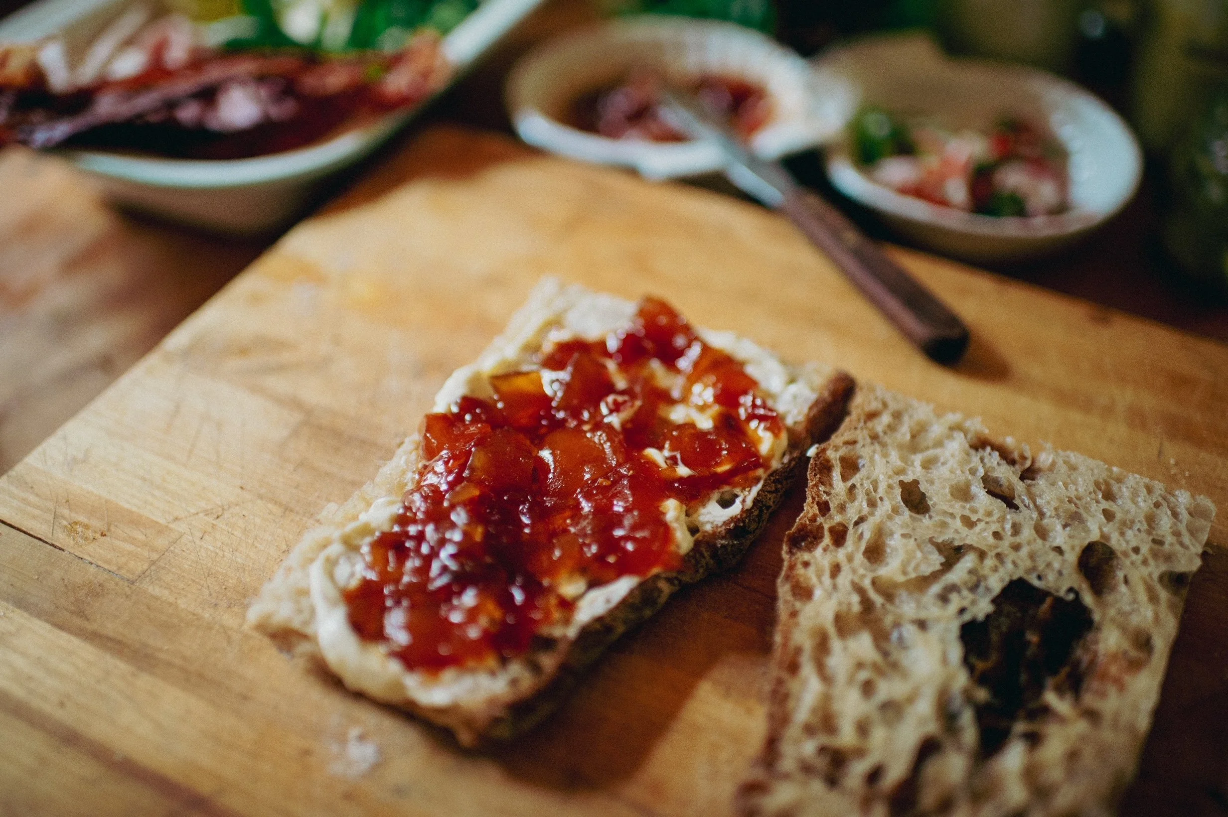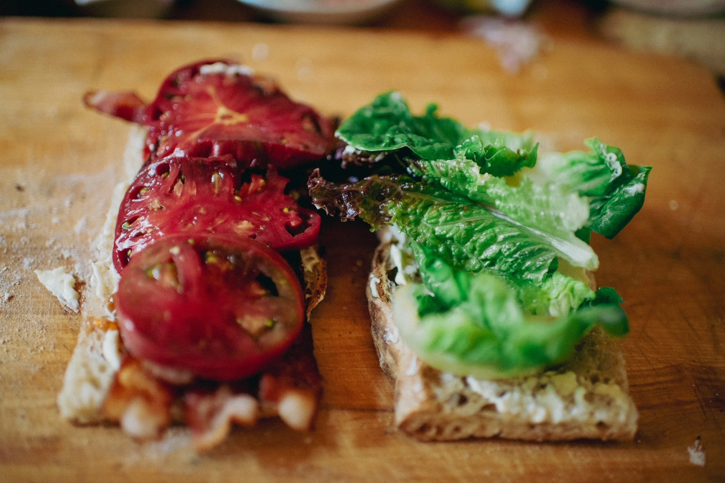This is a beach sandwich only if you are vacationing at the beach. But if you are vacationing at the beach it is a very delicious choice to sit and eat in the morning by the breaking waves. It is a simple sandwich with variations that are slight and often revolve around the bread. I, for one, am fond of a BLT on an english muffin. For the purposes of this tutorial we will use the slab bread, because we have it and I didn’t make english muffins. I would like to suggest that no matter what the bread, toast it and butter it so the butter melts into the mayo and chutney and mixes with the juice of the tomato. I did't do that for this tutorial and was not as happy with the results as I should have been. This BLT consists of mayonnaise, tomato chutney, bacon, lettuce and tomato.