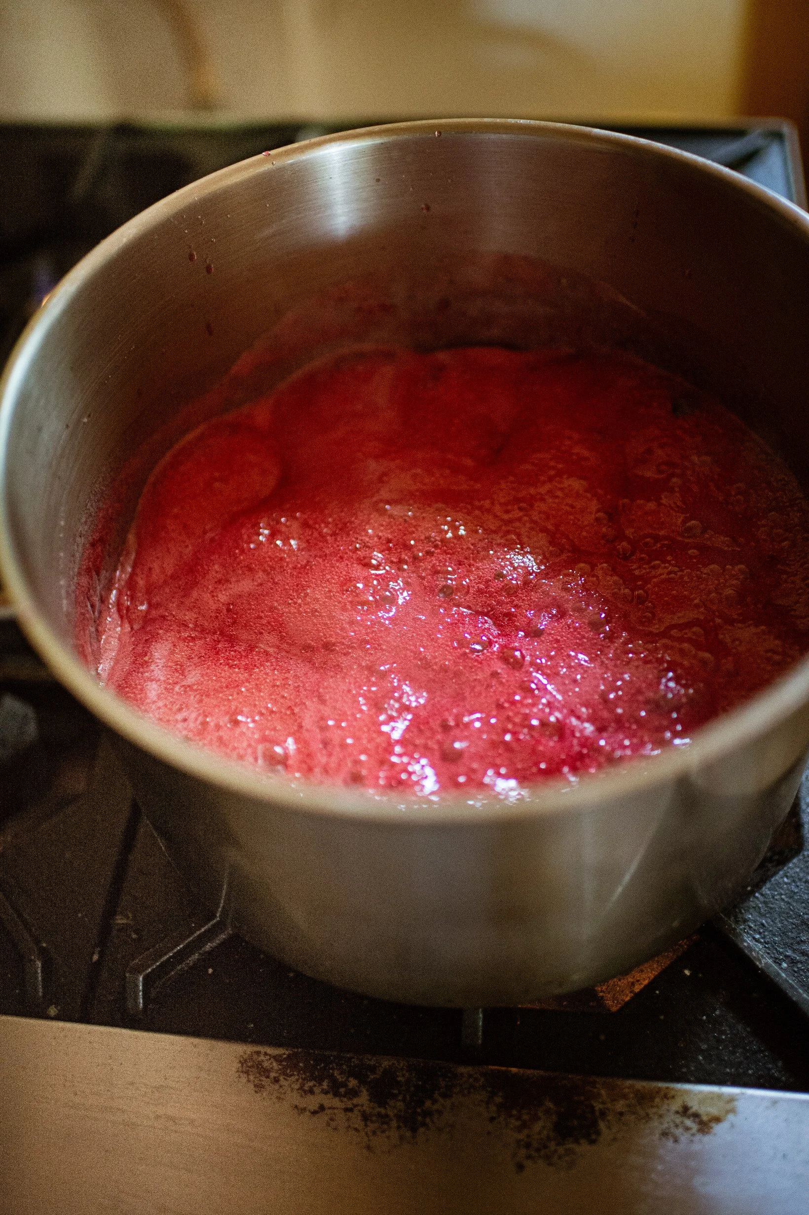 5. At the 1o minute mark add the remaining raspberries and stir until they are softened, translucent but haven’t lost their shape…….3-5 minutes