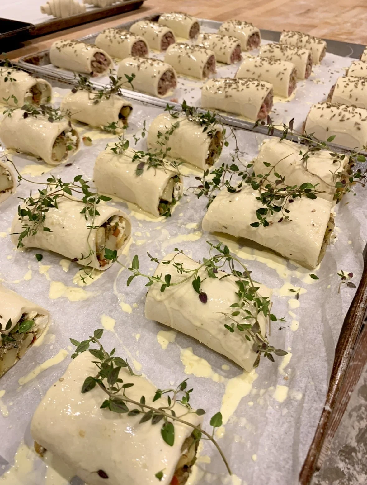 Roll out your puff in a rectangle, 1/8 to 1/4 inch thick. I would lean on the thinner side as these are smaller bites, but you have to be careful that it is not too thin that your puff rips with the moisture of the peppers. Cut the dough into strips roughly 3 inches wide. The length doesn’t really matter. Cut the peppers into strips and lay the strips along the bottom half of the puff, along the length of the dough. Top the peppers with feta cheese. Egg wash the top edge of the dough. Roll the peppers and feta from the bottom edge up to the top and seam at the egg wash side. Cut into little rolls and inch long and tray, seam side down. Chill for 15 minutes. Before baking, egg wash the top of the roll and top with little sprigs of thyme. Bake at 400 degress F until golden brown.