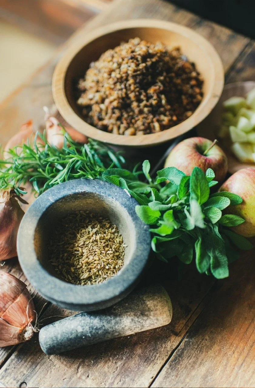 Toast the fennel seeds in a pan over low heat until fragrant, then crush lightly. Heat the vegetable oil in the pan, add the onions and garlic and cook until caramelized roughly ten minutes. Add the fennel, sage, rosemary and thyme. Set aside. Wipe out the pan and add and melt the butter. Add the apples and toss for a few minutes before adding in the sugar. Caramelized the apples in the sugar and then add the vinegar to deglaze the pan. Set aside. Mix together the pork, apples, breadcrumbs and salt in a bowl. Add the onion and garlic mixture and combine thoroughly.