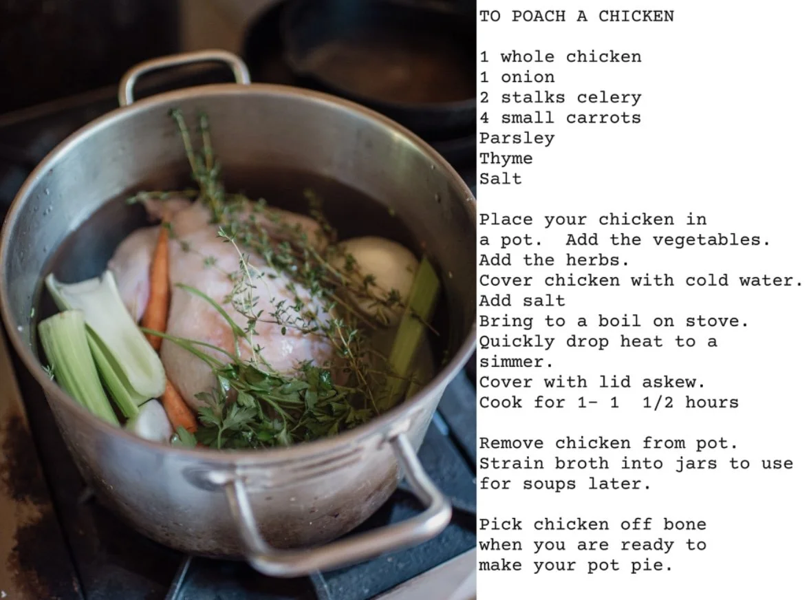 Poach your chicken. Strain the broth into a jar for later use. Pick chicken off the bone and tear into good size for you pot pie.