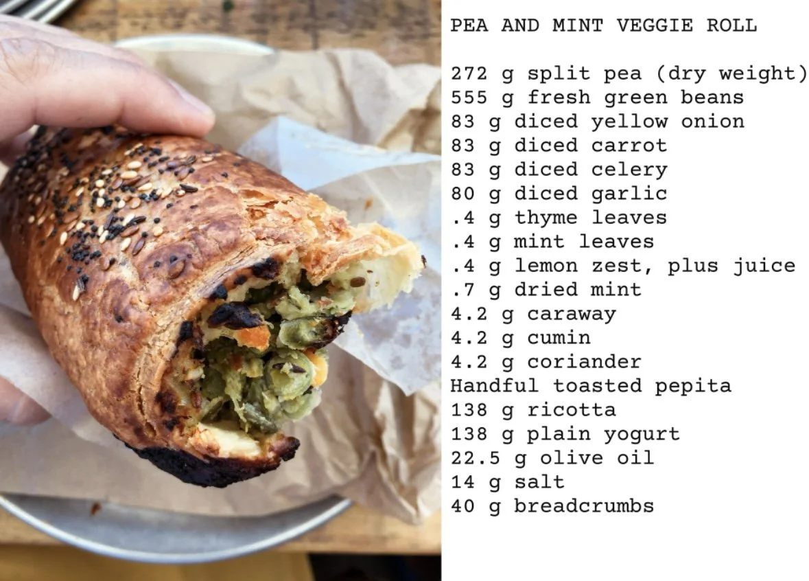 It was a day of truly good eating and my first experience with the pie scene in Australia as something beyond the quick pie shop mince options with packaged tomato sauce. We indulged in an assortment and yet with all of my love for the meat pie, my favorite pie from the Bread Social was a Pea and Mint Veggie Roll. It was a highly spiced and herbed roll made with split peas, fresh green beans and a combination of yogurt and ricotta. I was so enamored that I reached out to the owners over Instagram and asked for the recipe. It was a long shot, as most cooks keep recipes close, but I also knew that most bakers were delighted to share. They quickly responded with the whole formula for the veggie roll, along with another recipe I enjoyed, the Portuguese Custard Tart. I will share that recipe another time.